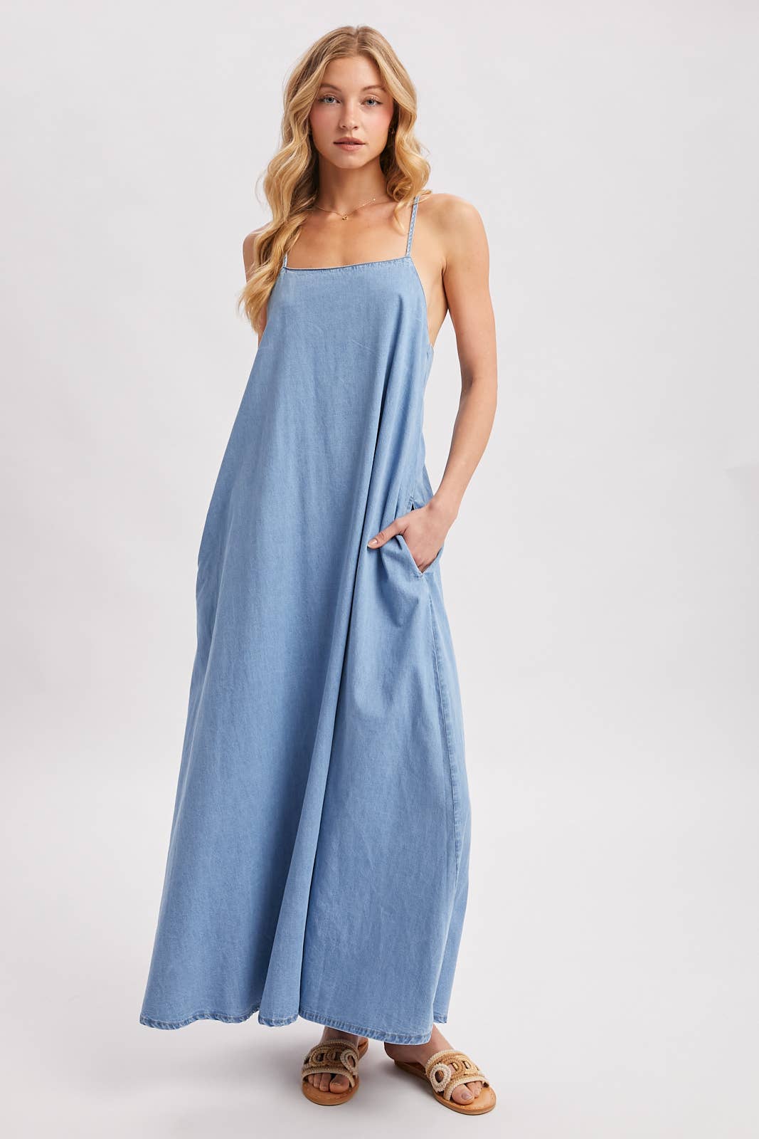 This effortless maxi dress offering a relaxed and voluminous tent silhouette. The design features a simple, straight neckline supported by delicate, adjustable spaghetti straps, providing a clean and minimalist front. Practicality is added with functional side-seam pockets, while the back reveals a deep, gathered scoop neckline that enhances the dress's airy movement and flow. Perfectly blending comfort with a laid-back summer aesthetic, this flowy piece is an ideal choice for easygoing daytime wear. -Model is 5'9" and wearing a Small