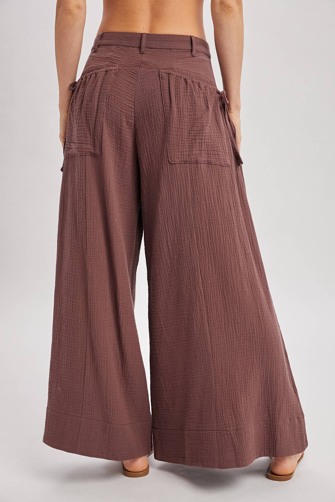 These pants are a pair of relaxed, wide-leg trousers rendered in a deep, earthy chocolate brown and natural beige hue. Crafted from a textured, crinkle-gauze fabric, they feature a breezy, bohemian silhouette that flares generously towards the ankles. The design is anchored by a structured waistband with belt loops and a button closure, while oversized patch pockets on the front hips add a utilitarian touch. Additional details include adjustable drawstring ties at the sides of the waist and a wide, horizontal hem panel, enhancing the casual, resort-ready aesthetic. -Model is 5'9" and wearing a Small