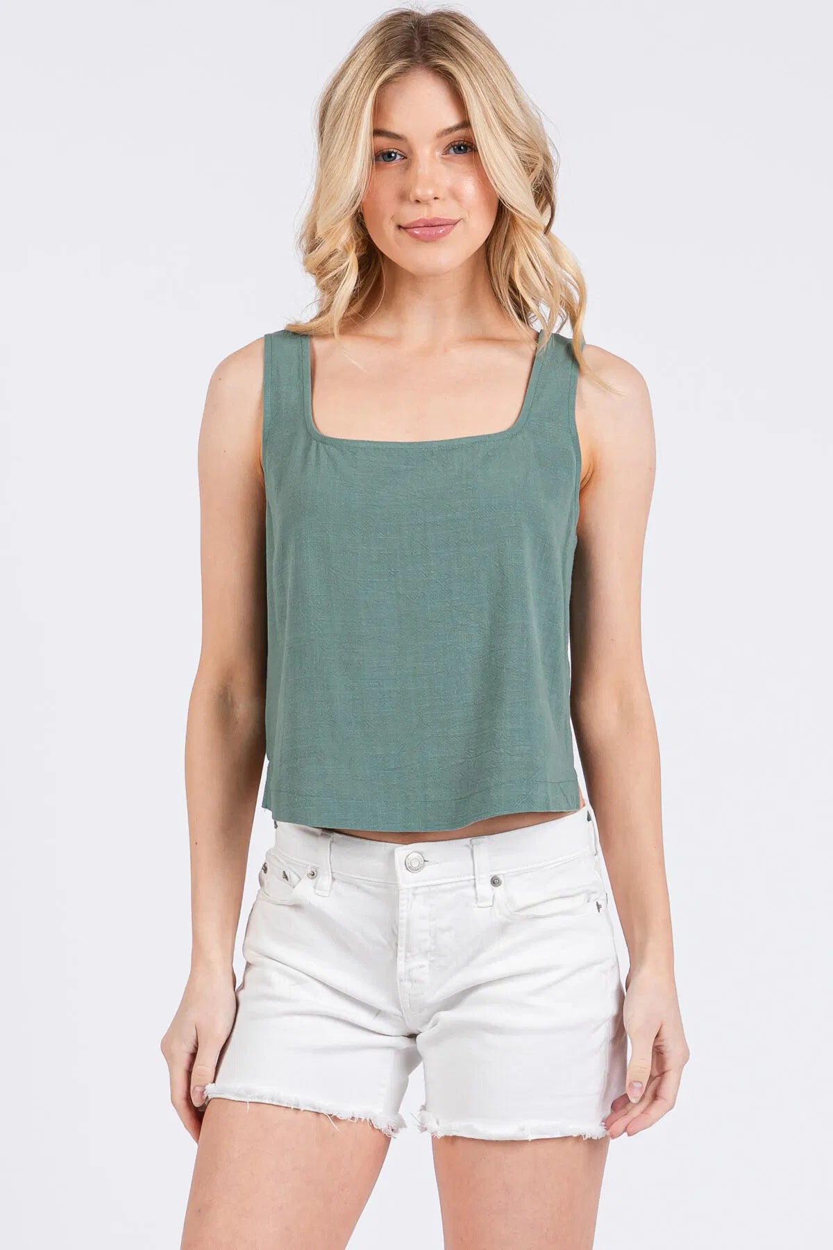 Chic, structured, and effortlessly elevated — this square neckline top features sleek side panel detailing that creates a flattering, modern silhouette. Crafted from a breathable 70% viscose, 30% linen blend, it offers a soft, lightweight feel perfect for warm‑weather styling. Designed to pair seamlessly with the matching pants (VP3553), this top brings a polished, coordinated look to casual days, work‑to‑weekend outfits, and vacation wardrobes.