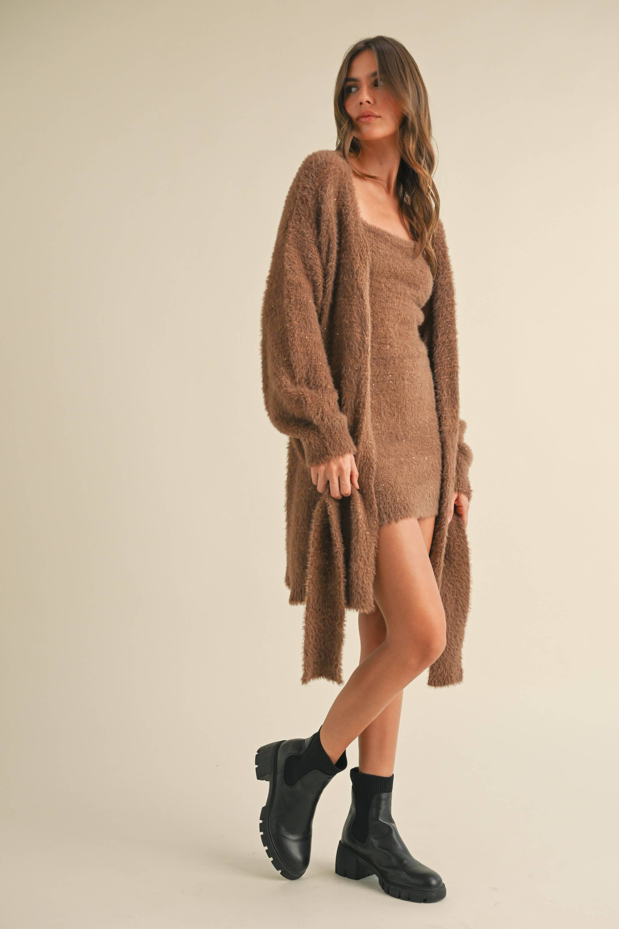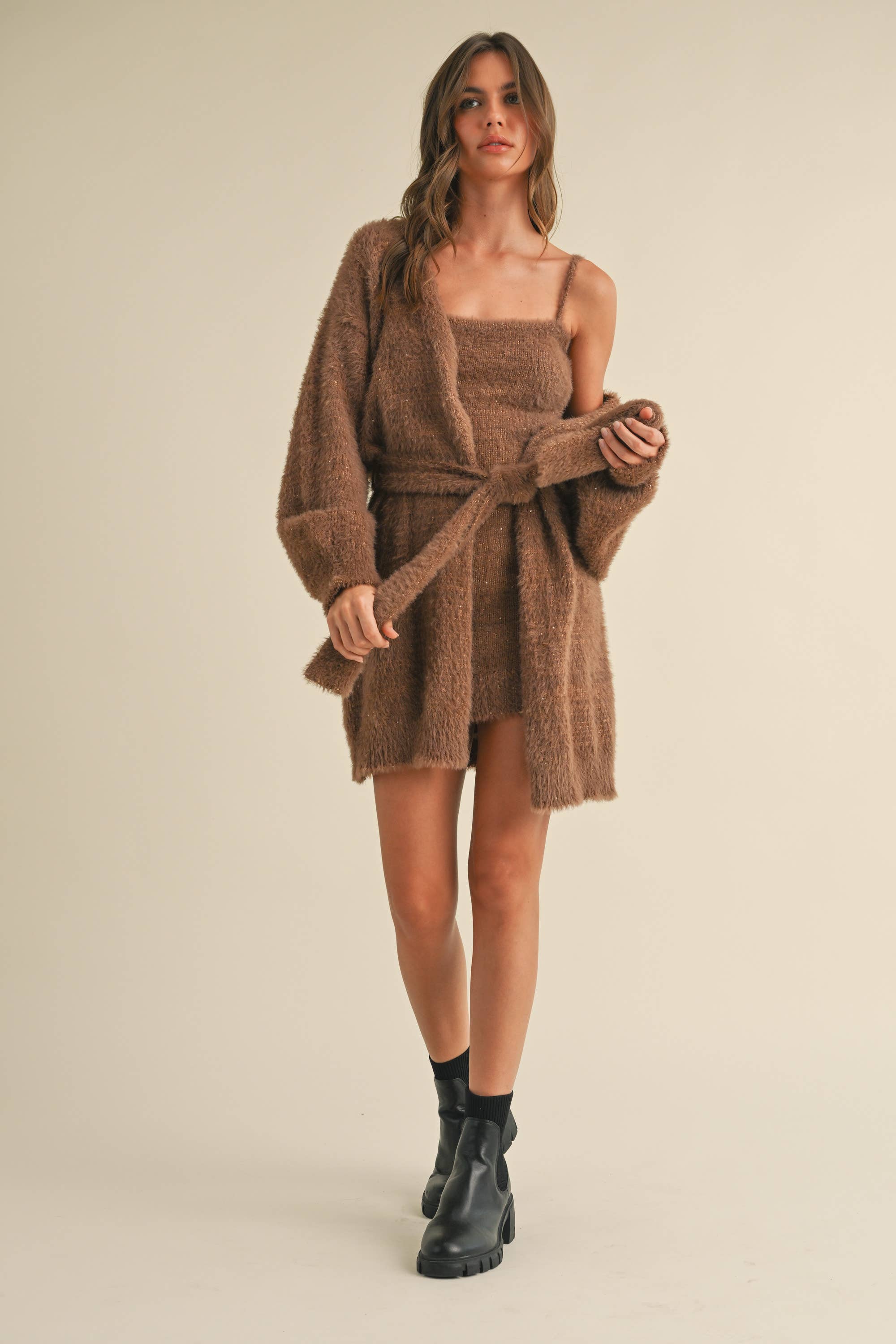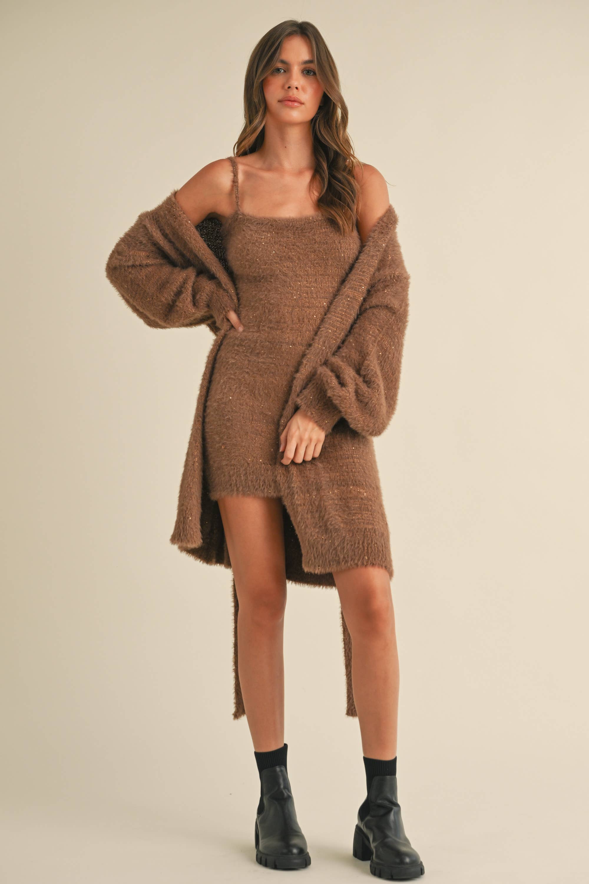 FUZZY SOFT SLEEVELESS TUBE MINI DRESS AND CARDIGAN TWO PIECE SET Turn heads this season in our fuzzy sleeveless tube mini dress with coordinating cardigan. The soft knit texture feels luxurious, while the cropped cardigan adds a cozy layer of charm. Whether you’re celebrating the holidays or styling a chic winter look, this two‑piece set is your go‑to for comfort and confidence.