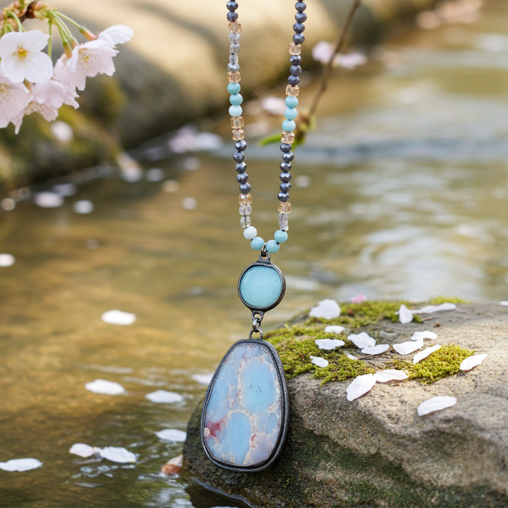 This striking, long necklace features a beautiful mix of variegated amazonite beads, accented by crystal beads. It is perfectly anchored by a unique, Large Jasper pendant with a striking, raw texture. The natural beauty and elegant length of this piece make it a uniquely sophisticated and essential accessory for a chic, bohemian style.