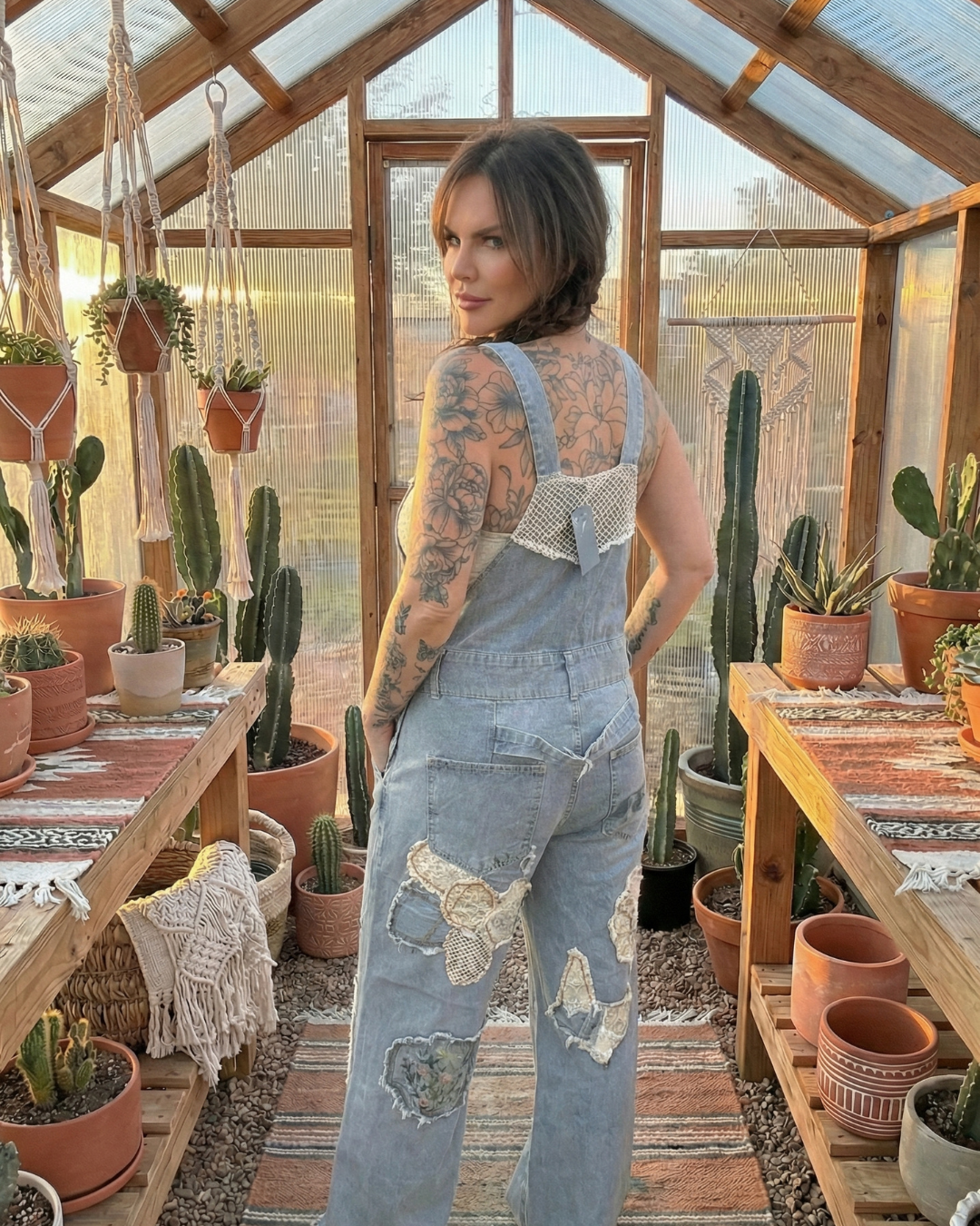 Designed in a roomy fit denim overalls, elevated with layered mesh detailing and novelty floral patchwork accents crafted from assorted woven fabrics. Features intricate floral embroidery, an accented buckle back detail, adjustable straps, and functional belt loops. Finished with a hip button closure and an exaggerated chest pocket for a casual statement piece that’s easy to style.