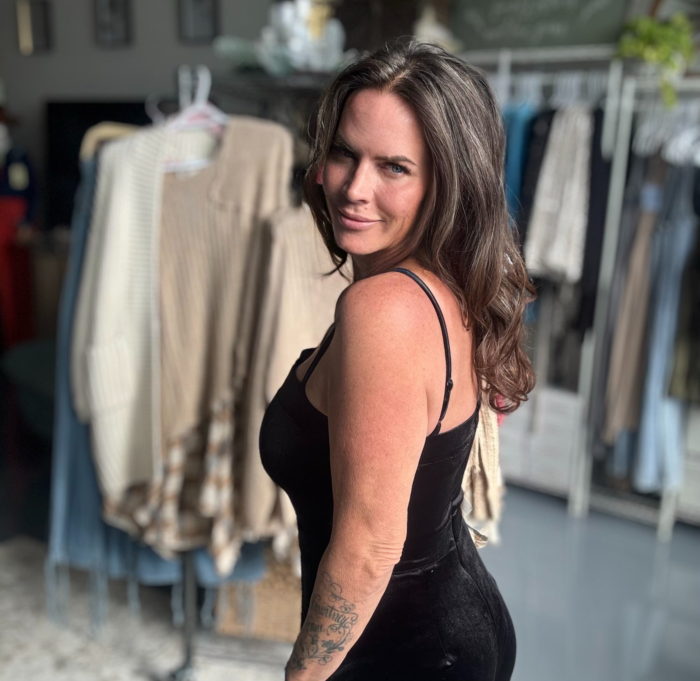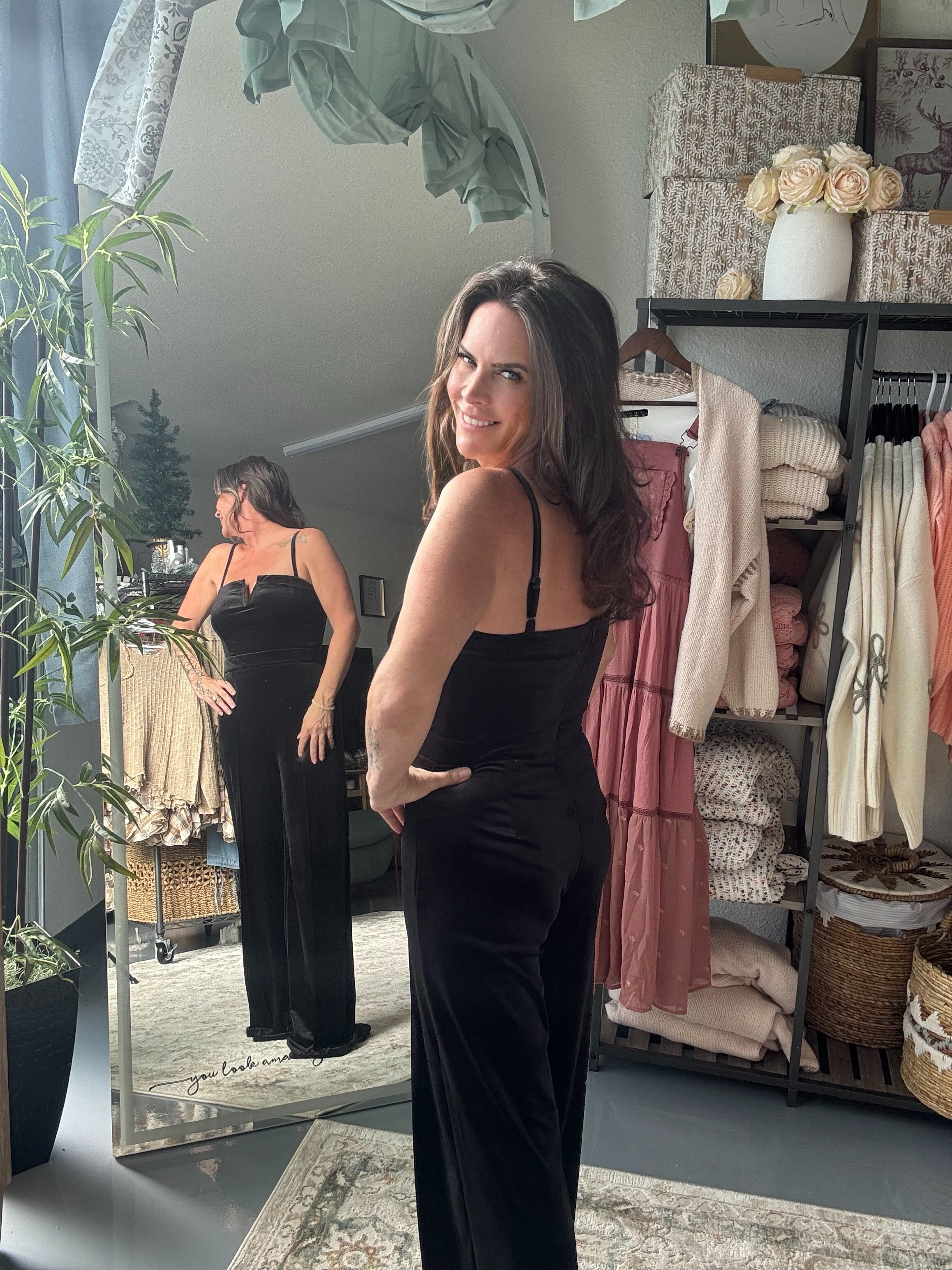 Elevate your style with our Crushed Velvet Love jumpsuit. Featuring a zippered back and adjustable straps, this structured one-piece is perfect for weddings, casual events, formal occasions, and everything in between. With its soft velvet material and straight legs, this black jumpsuit is both elegant and glamorous, making it a must-have for any special occasion or holiday outfit.