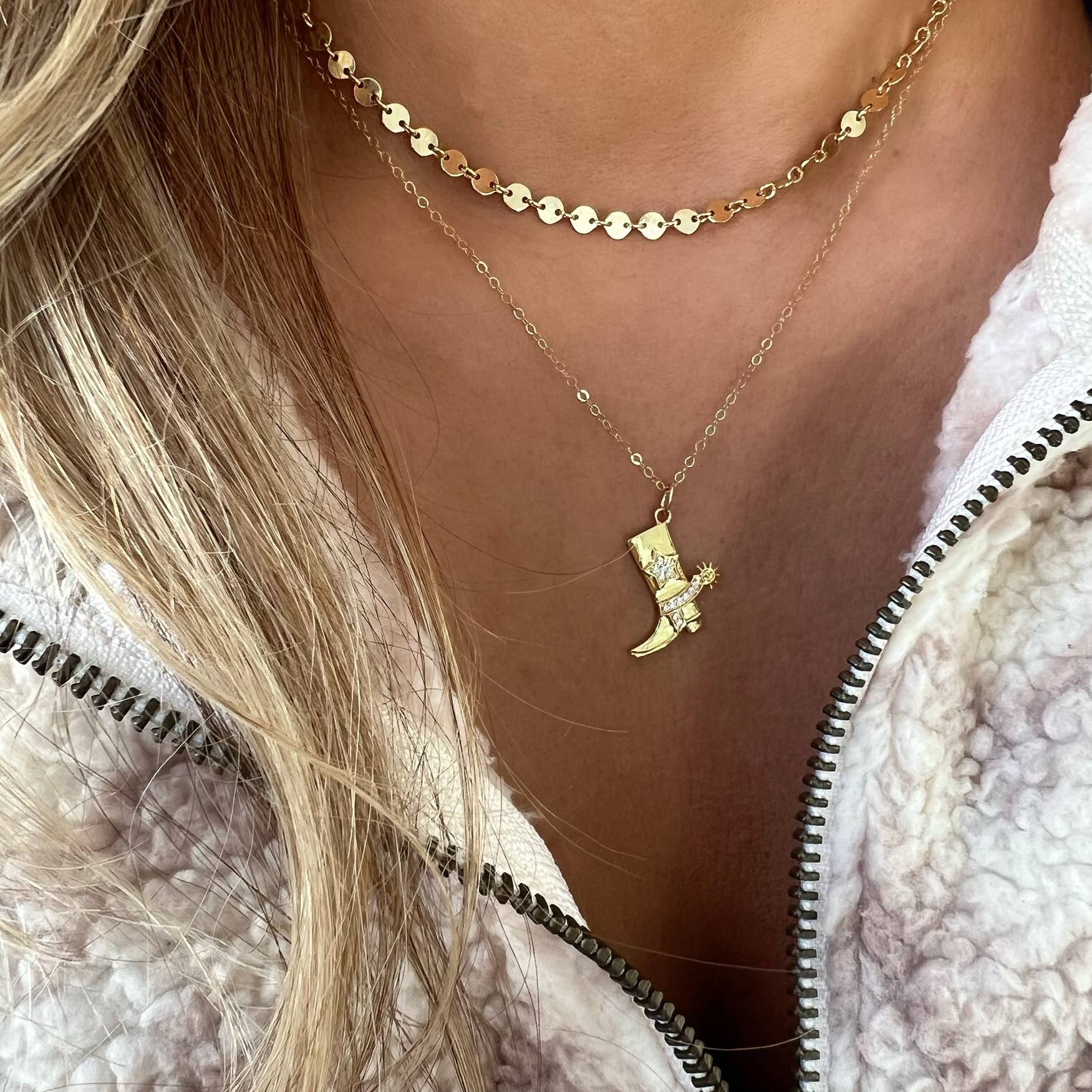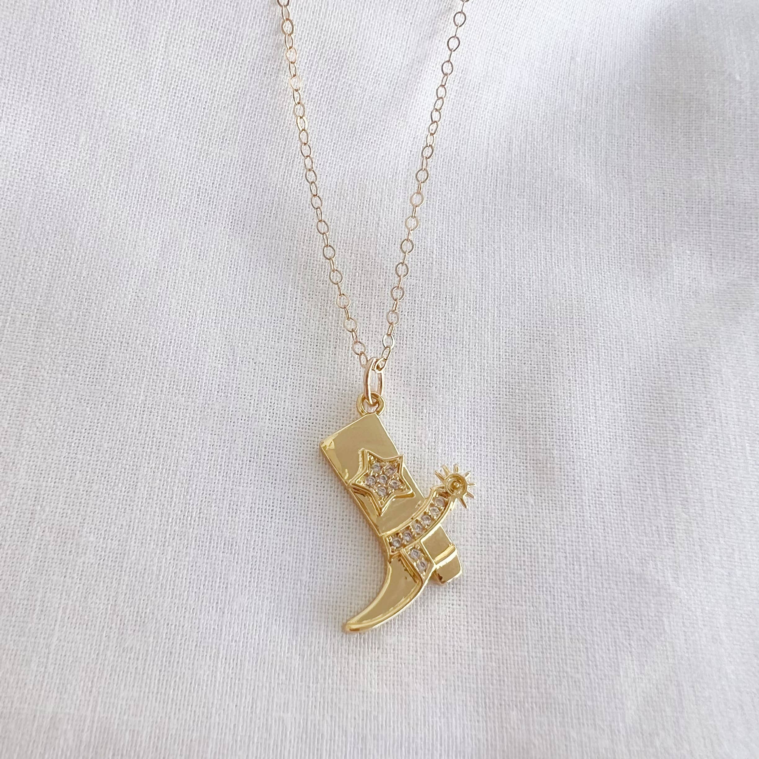 Gold-filled cowboy boot pendant strung on our signature 14/20 14k gold filled dainty cable chain. - Length: 18” - Chain: 14k gold-filled signature dainty cable chain with spring clasp. - Pendant: 25mm x 19mm - High quality 14k gold filled chain which is 14/20 certified and either made in the USA or Italy. Chain does not turn, tarnish, or rust. - Handmade with the highest standards & quality materials. This item is handmade and shipped with love