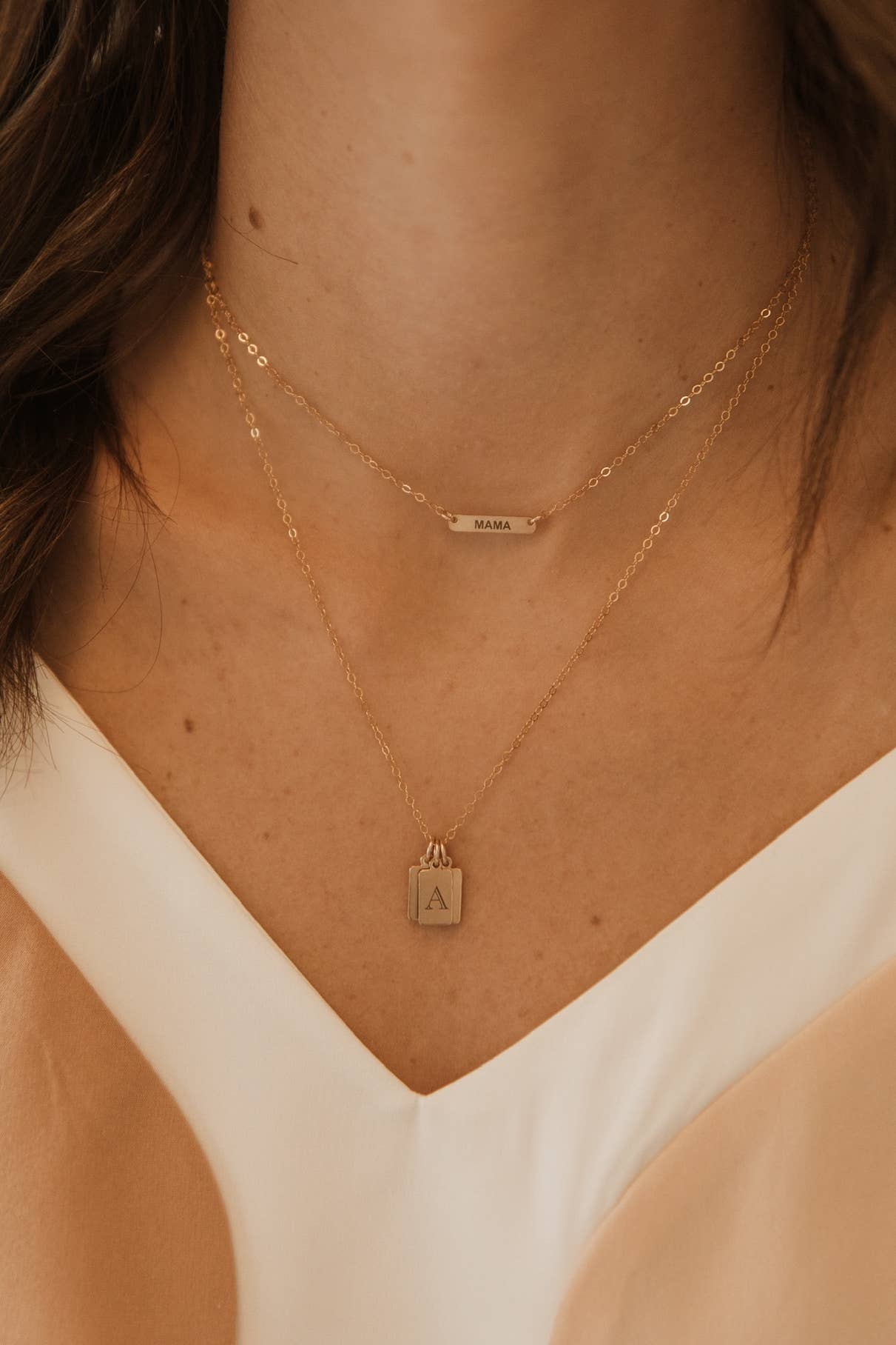 Engraved mini "mama" bar pendant paired with our signature 14/20 14k gold-filled dainty cable chain; adjustable. - Chain Length: 16" + 2" extender - 14k gold-filled dainty cable chain with spring clasp. - Tag charm: 16mm x 3mm / .5" - Charm is engraved on-site in our studio. Please note, this is a preview. Final designs may vary slightly. - High quality 14k gold filled chain and charm which are14/20 certified and made in the USA. Does not turn, tarnish, or rust. - Handmade with the highest standards & quality materials.