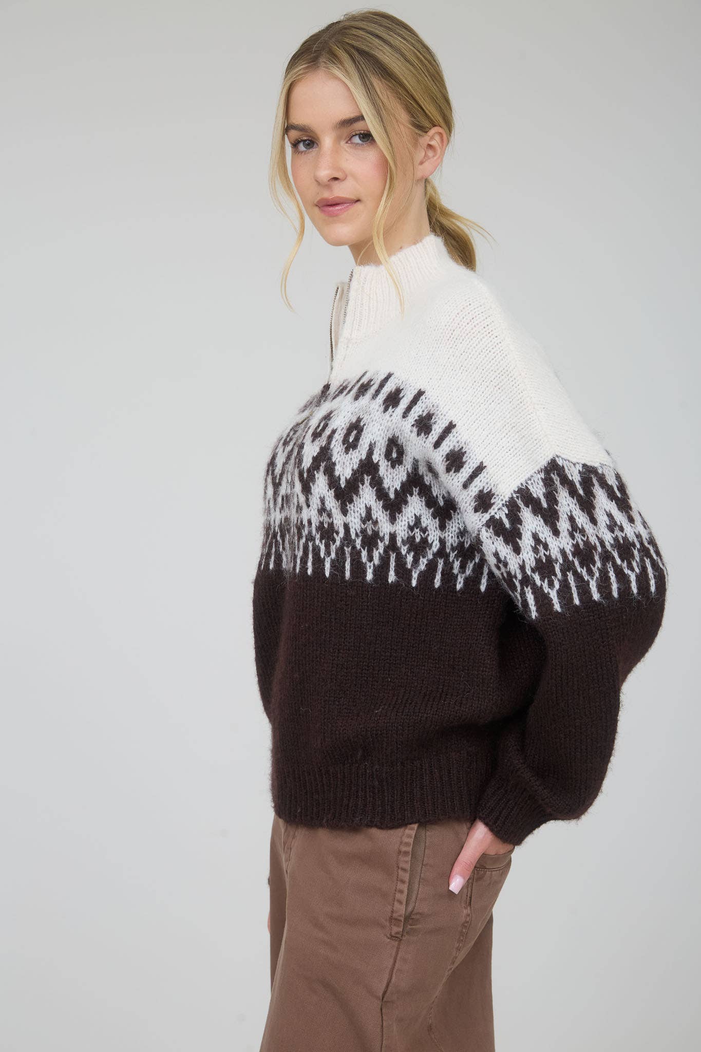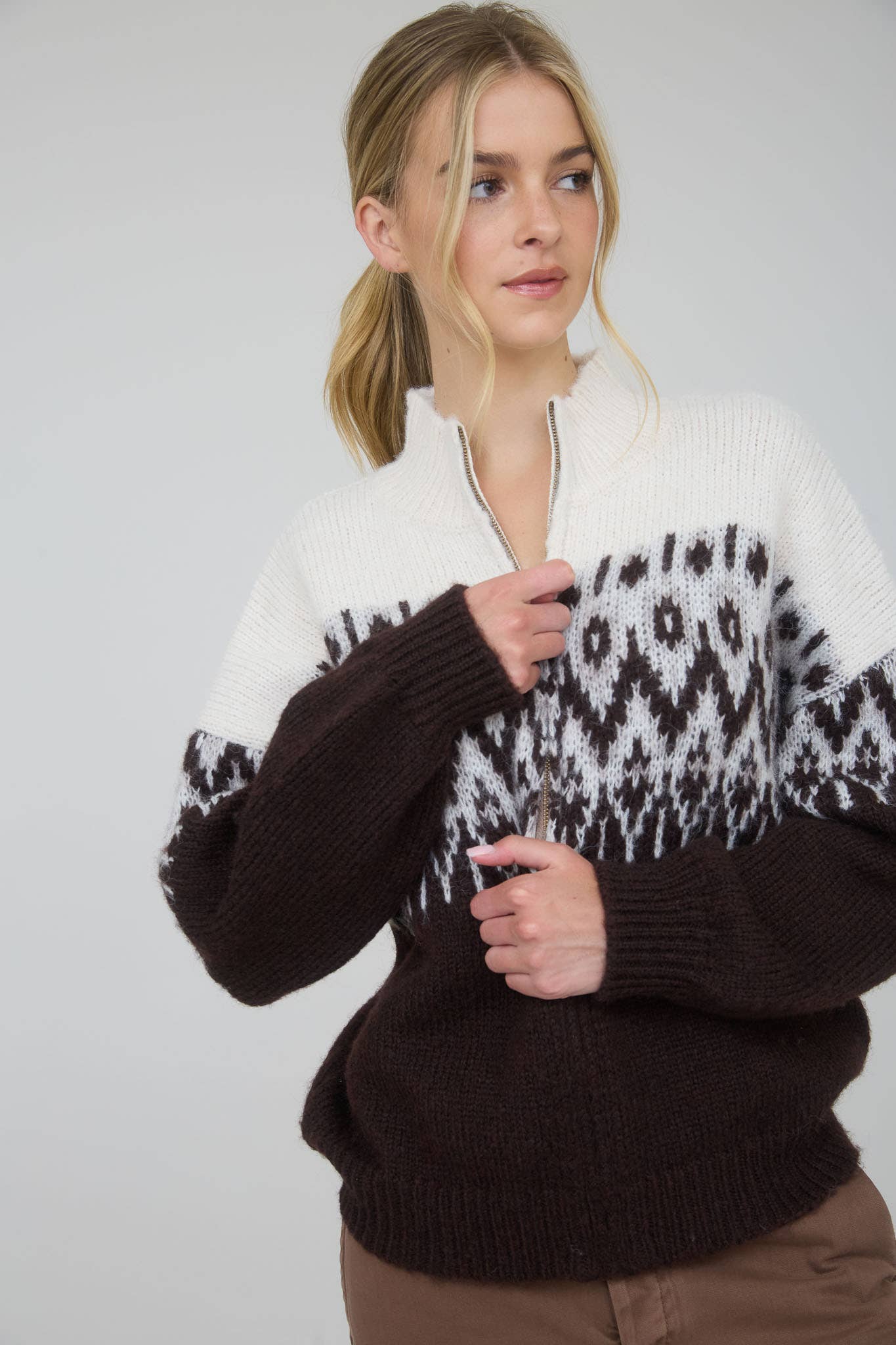 Stay warm and stylish in the Fair Isle Half Zip Knit Pullover Sweater, a cozy-chic essential for fall and winter. Featuring a classic mock neckline, metal half-zip front, and a relaxed silhouette with extended drop shoulders, this sweater blends comfort with seasonal charm. The multicolor Fair Isle yoke pattern adds a festive touch, making it perfect for holiday gatherings or everyday layering.