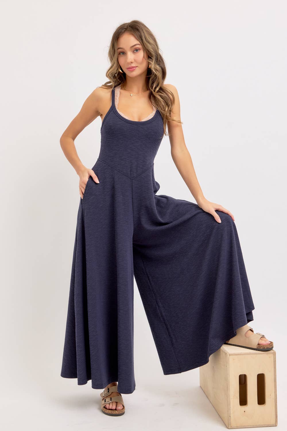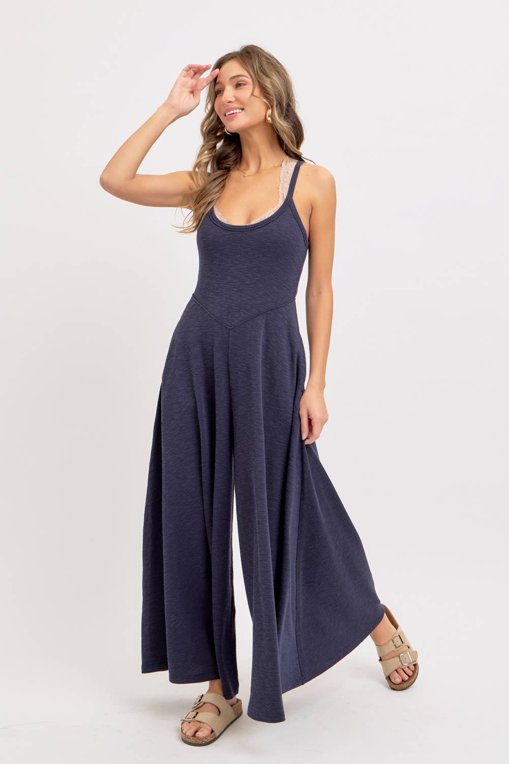 Slip into effortless comfort with this soft jersey knit one‑piece jumpsuit, designed with a relaxed fit and a flowy wide‑leg silhouette that moves beautifully with you. The scoop neckline, fitted bodice, and crisscross racerback straps create a flattering, modern shape that feels as good as it looks.