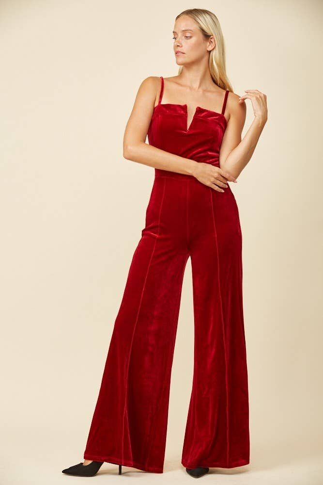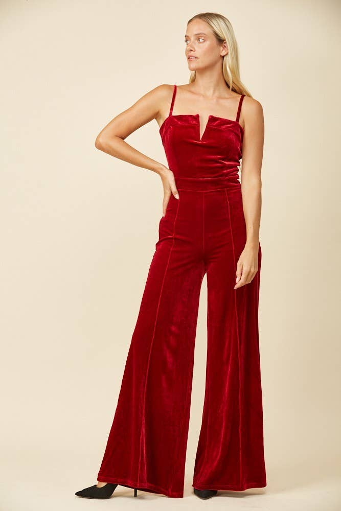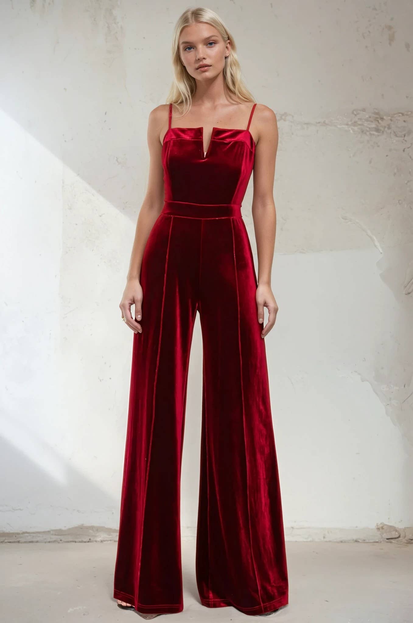 Make a bold entrance in the Structured V-Trim Velvet Jumpsuit, a butter-soft one-piece designed to turn heads at every occasion. Crafted from plush velvet fabric, this jumpsuit features a structured silhouette, straight-leg pants, and a zippered back for a sleek, tailored fit. The adjustable spaghetti straps and V-neckline add a touch of elegance, while the rich WINE hue brings depth and drama to your wardrobe.