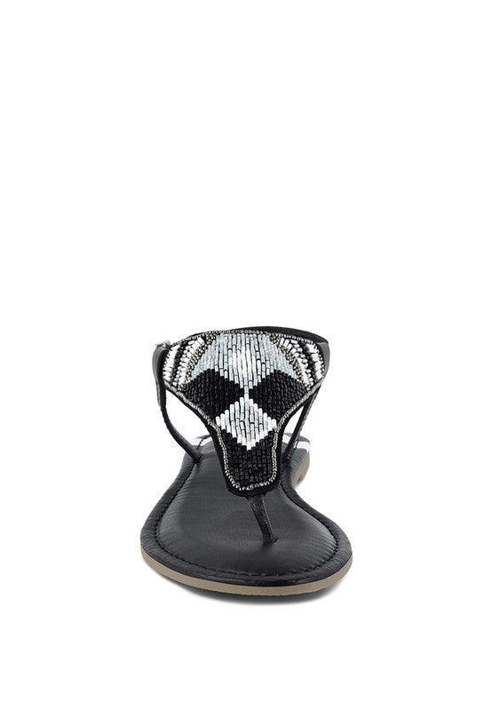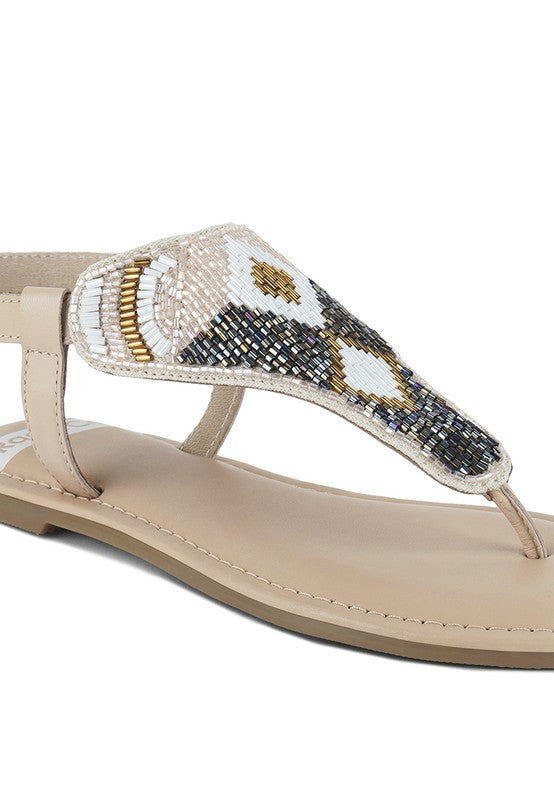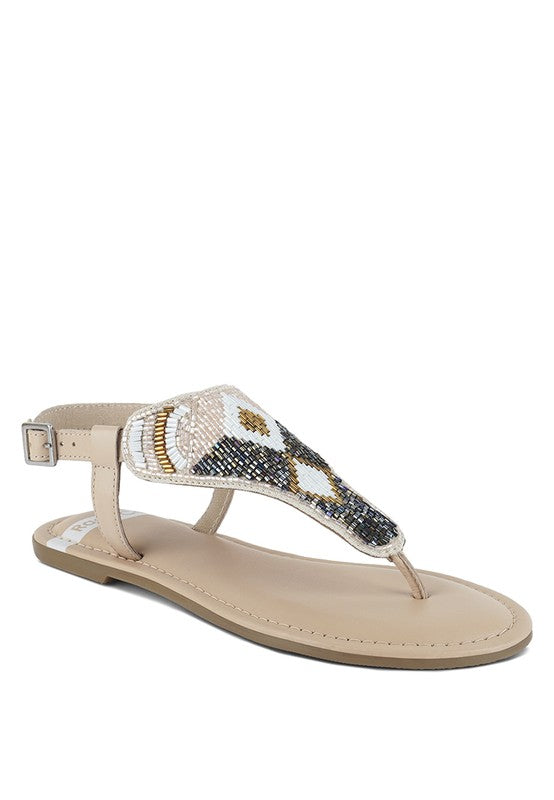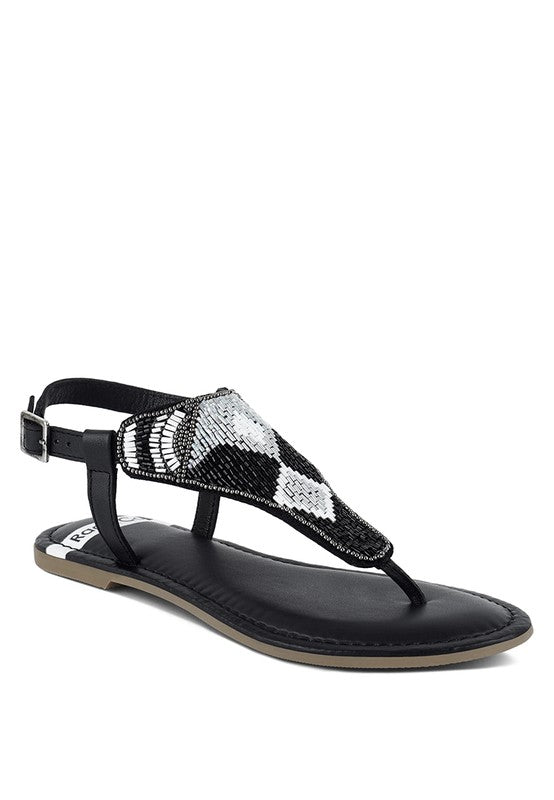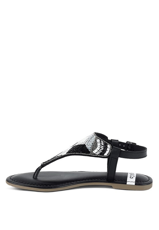 Slide into these genuine leather flat sandals and experience ultimate luxury. Designed with an adjustable pin buckle strap and eye-catching contrasting bead embellishments, the stunning pair also features a plush cushion insole. Whether you're out shopping or enjoying a date night, these round-toed sandals will turn heads.