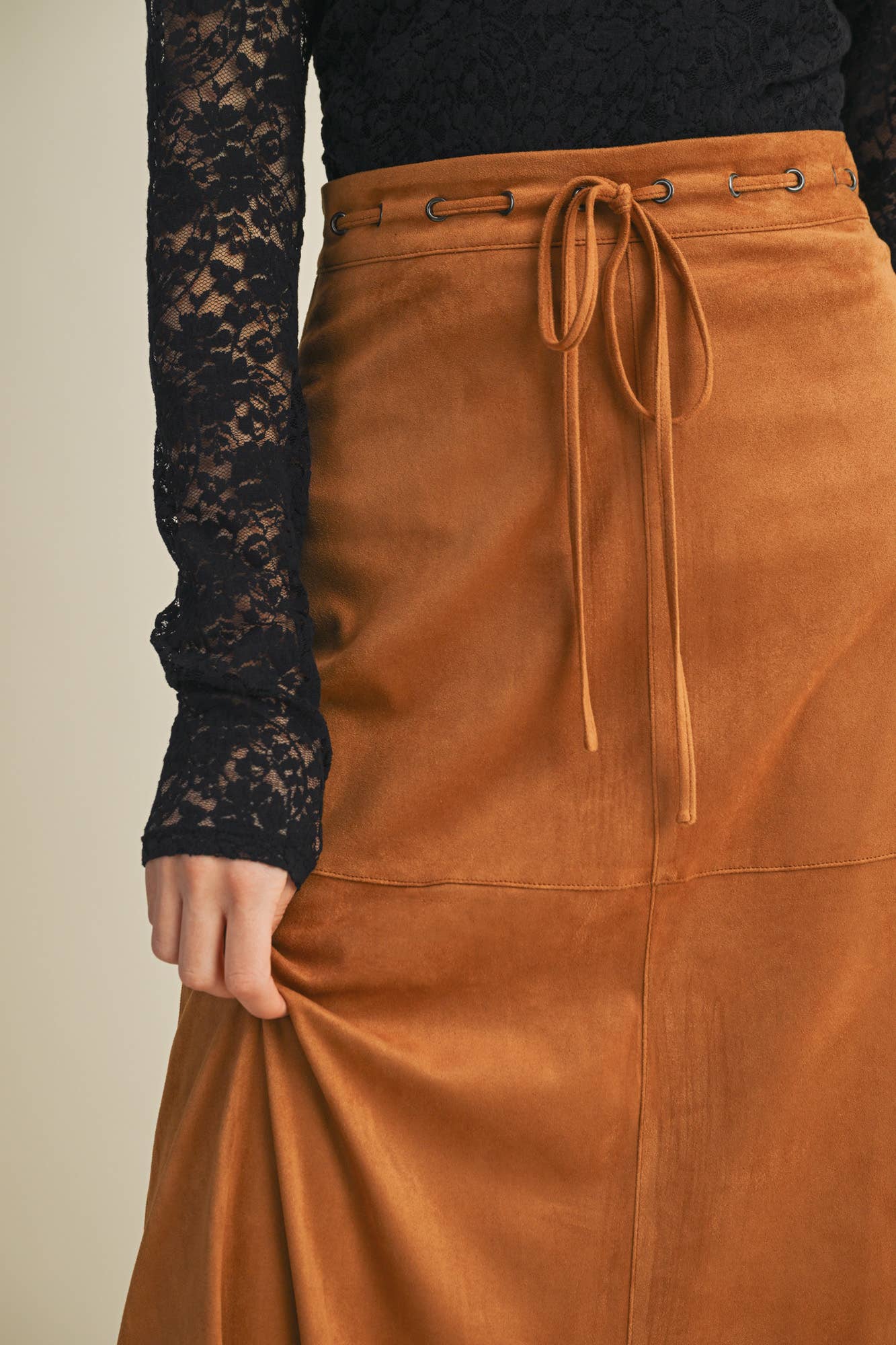 Soft structure meets effortless style in our Drawstring Suede A-Line Skirt—a fall essential with just the right amount of cinch. Crafted in a luxe camel suede, this midi-length silhouette flatters with a gentle flare and adjustable waist tie for a custom fit. Whether styled with boots or layered with knits, it’s your go-to for cozy sophistication.