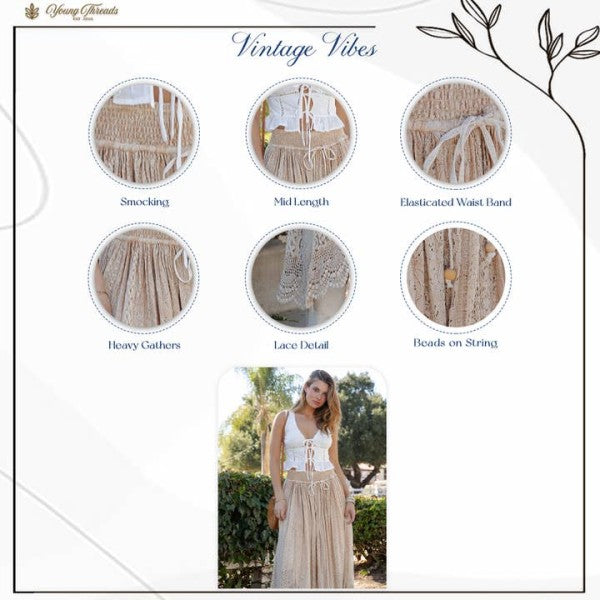 The Desert Dream Wanderer Skirt is a romantic, Western‑inspired lace maxi designed for effortless movement and everyday elegance. Crafted entirely from airy lace with a soft shirred elastic waistband, it offers easy comfort and a beautifully gathered, voluminous flow. The scalloped crochet lace hem and overdyed vintage finish add artisanal charm, while the full inner lining ensures smooth movement and confident coverage. Feminine, breathable, and timeless, this skirt is perfect for Spring–Summer 2026 and beyond — whether styled casually or worn as a statement piece.