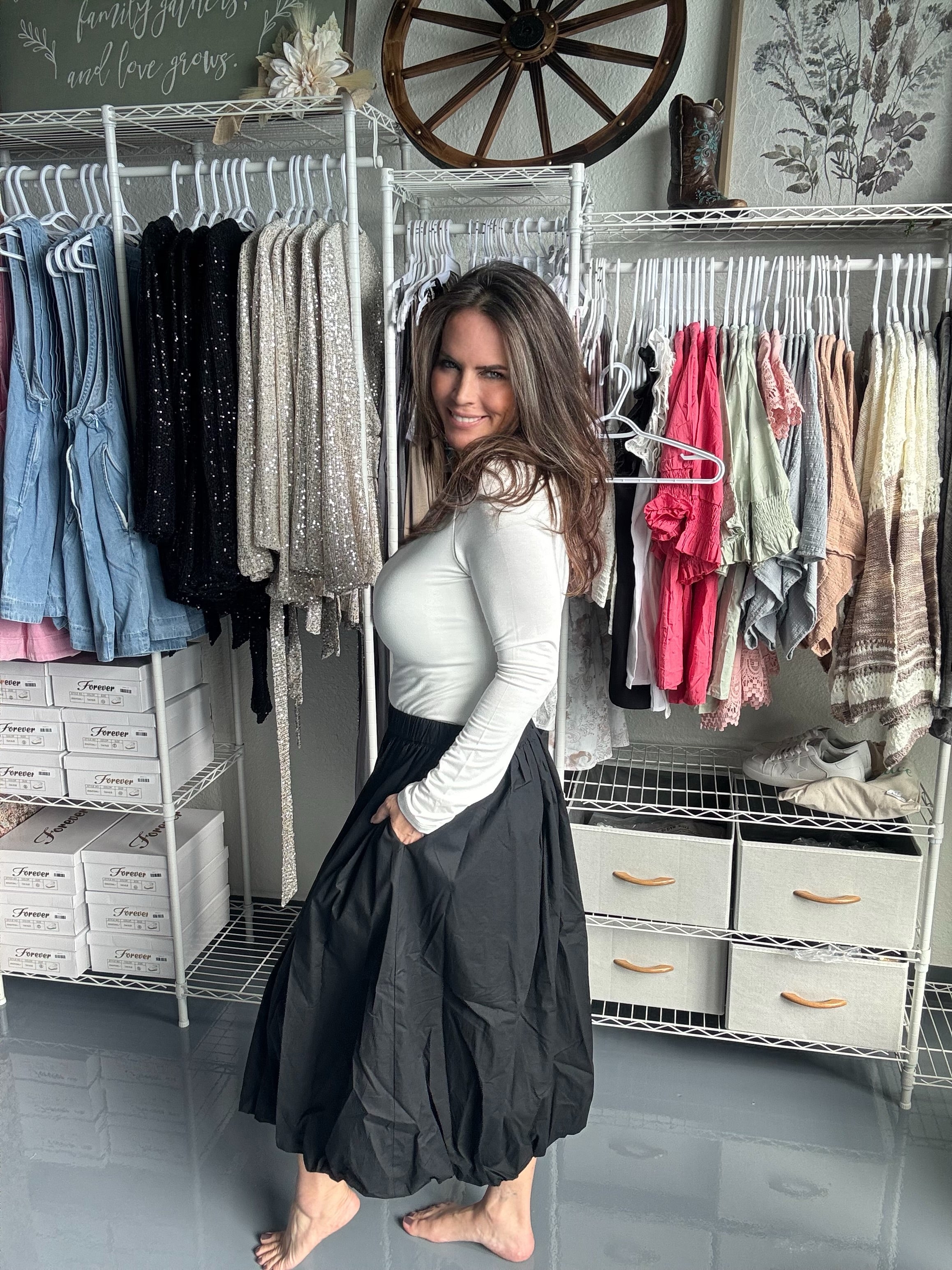 Elevate your style with The Bella Skirt, a truly timeless piece that effortlessly combines elegance with playfulness. Crafted from premium materials, this classy midi-length bubble skirt dances around you with every step, its delightful silhouette creating a sense of movement and charm. The elasticated waist ensures a perfect fit, allowing you to move with ease while radiating sophistication. Whether you’re dressing up for a special occasion or enjoying a sunny day out, The Bella Skirt is your go-to choice. Pair it with a chic cropped tee and your favorite flats for a look that’s both effortlessly stylish and wonderfully versatile. Embrace the joy of dressing up with this must-have wardrobe staple!
