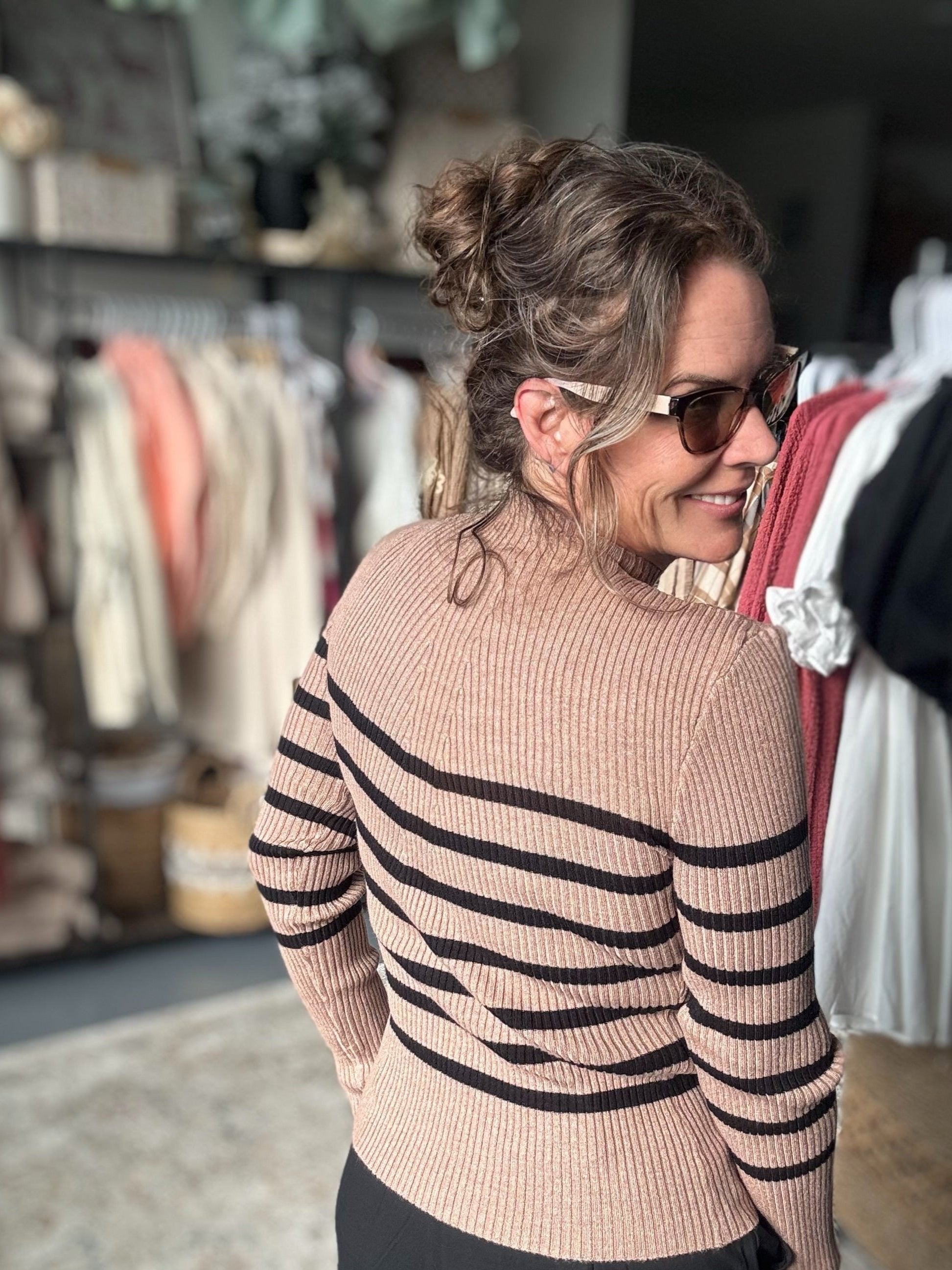 Stay stylish and cozy with our Striped Mock Knit Sweater. Made for both comfort and warmth, this trendy sweater can be dressed up or worn casually. Say goodbye to compromising style for comfort with this must-have addition to your wardrobe.