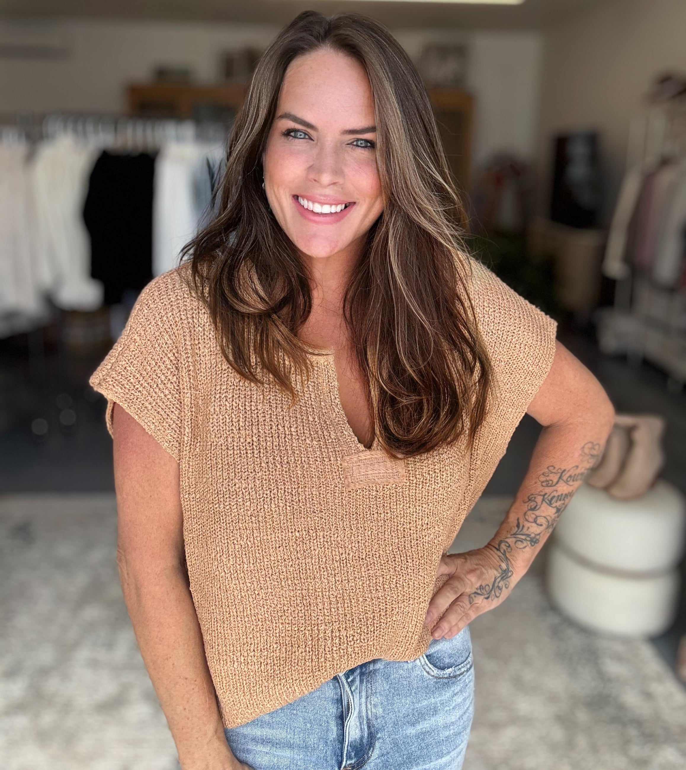 Whether you're layering it for a crisp morning market stroll or styling it solo for a cozy dinner out, this sweater brings comfort and chic together in one versatile piece. Available in Dark Brush Black, it’s the perfect neutral to anchor your fall wardrobe.